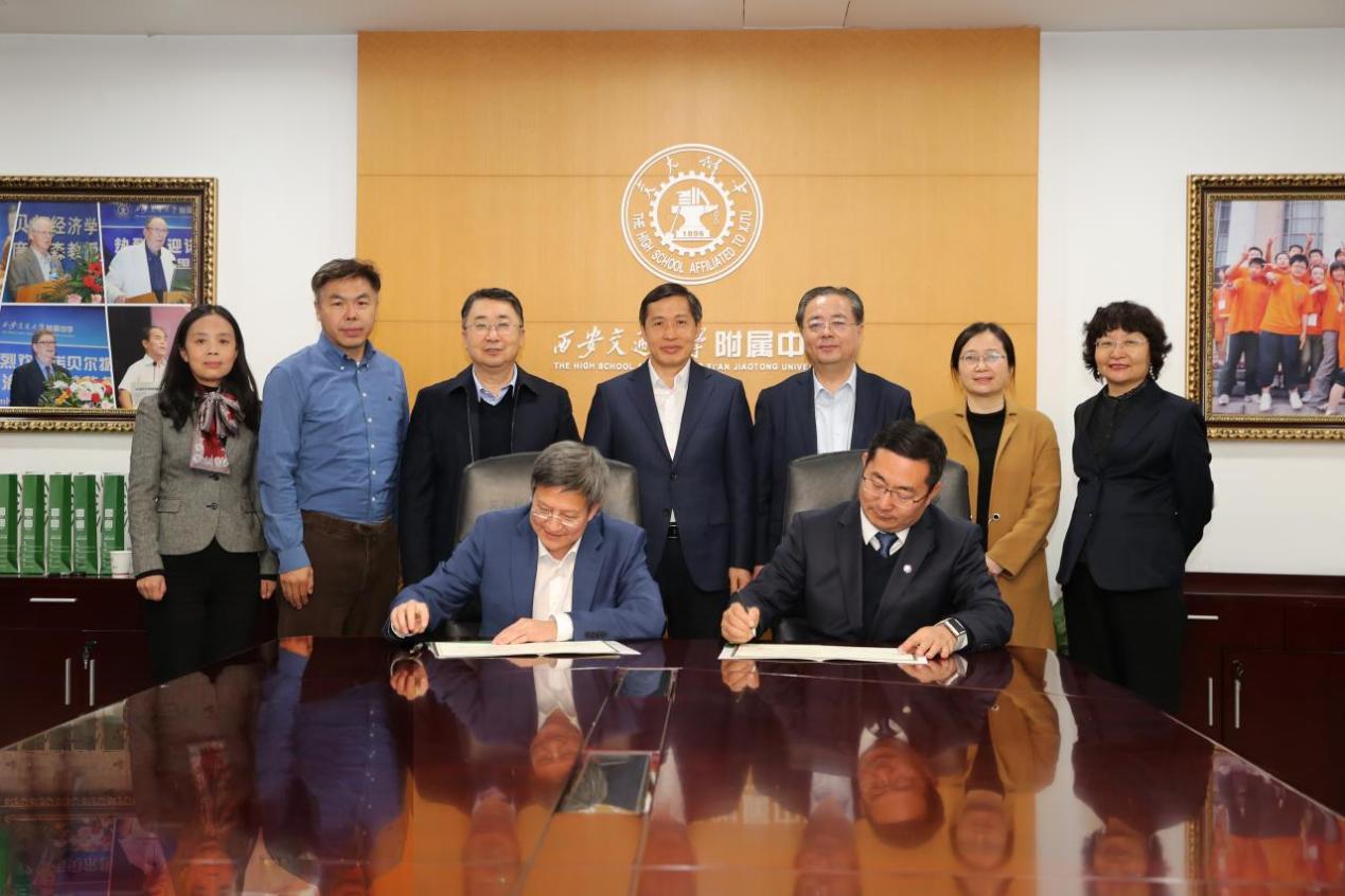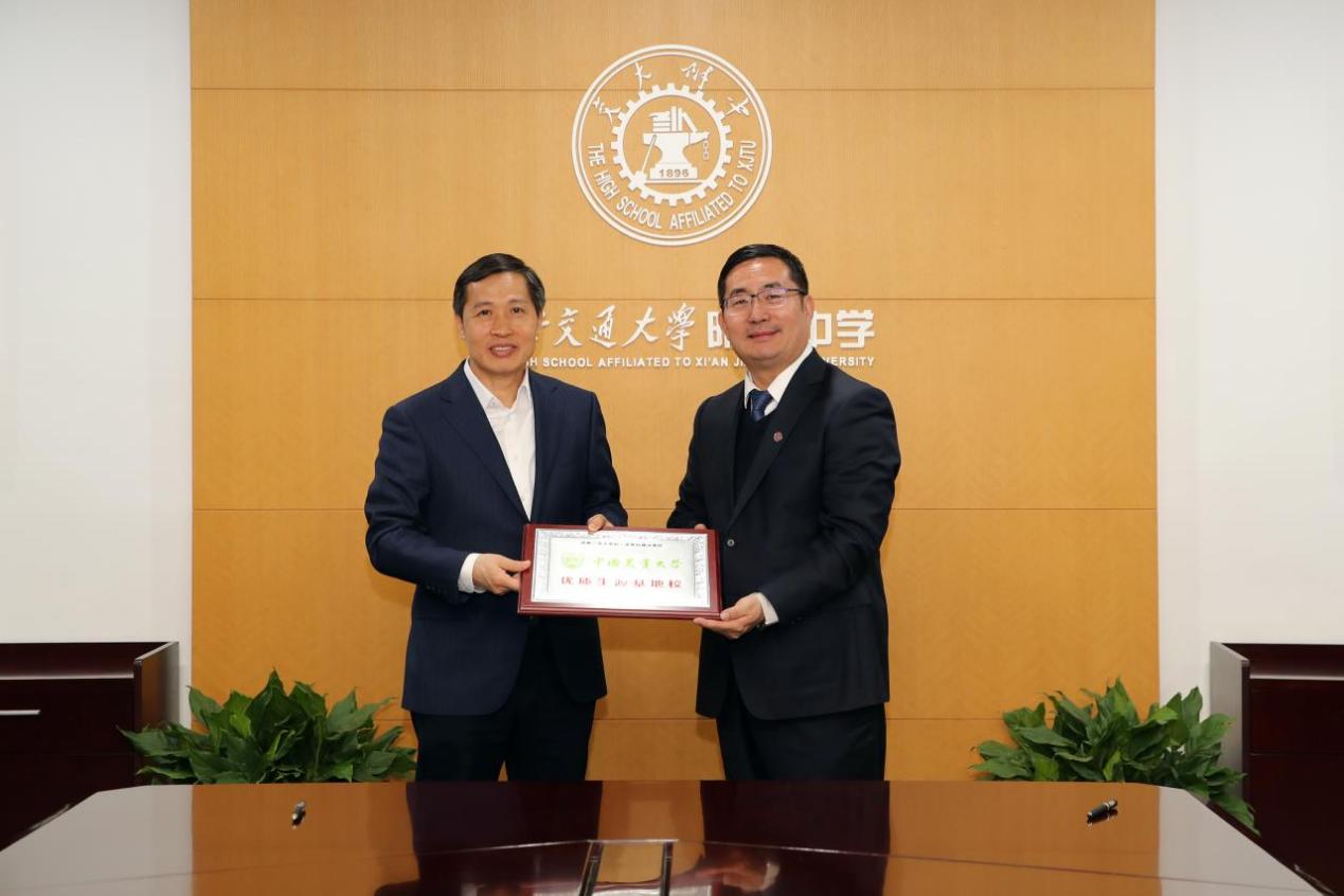 在与会人员的见证下,钟登华代表学校为西安交大附中授“优质生源基地校”牌匾,两校共同签订《优质生源基地校合作协议书》。