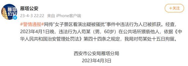 西安市公安局雁塔分局3日晚发布警情通报:网传“女子景区看演出疑被骚扰”事件中违法行为人已被抓获。经查西安有没有抓龙筋,2023年4月1日晚,违法行为人苟某(男,60岁)在公共场所猥亵他人,依据《中华人民共和国治安管理处罚法》第四十四条之规定,我局对苟某处十五日拘留西安专业抓龙筋。