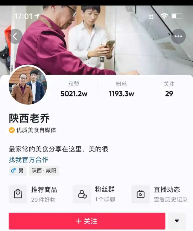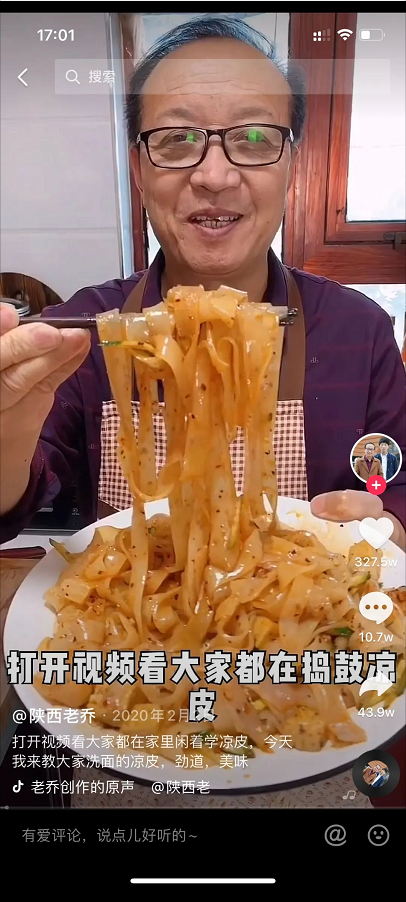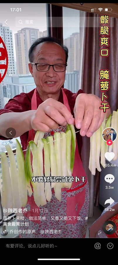 “陕西老乔”乔建忠的成名要比闻士善早。在他入驻抖音前,儿子乔飞已经把自己做饭的视频,分发到各个平台。经过多番测试,父子俩选择以抖音为主战场,很快便收获超1100万粉丝。