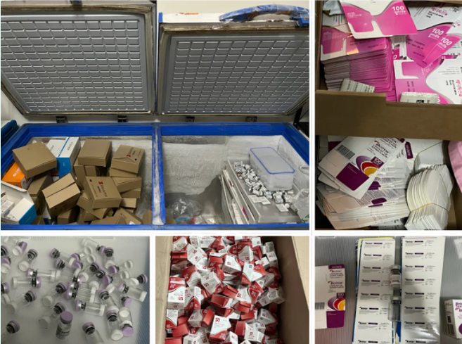 执法人员在涉案嫌疑人张某住所查获了假冒A型肉毒素等医美药品,以及自动薄膜、封口机、塑料枪、冰柜等物品。其中成品药26个品规(1654盒),半成品药14个品规(3725瓶),用于生产制造药品的外包装、标签、说明书、瓶托共14种(55箱零24个)西安抓龙筋工作室。