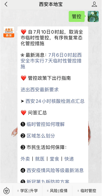 温馨提示:微信搜索公众号西安本地宝,关注后对话框回复【管控】查看西安管控区域及范围,获取解除管控通知,了解管控下市民出行,就医,外卖要求。