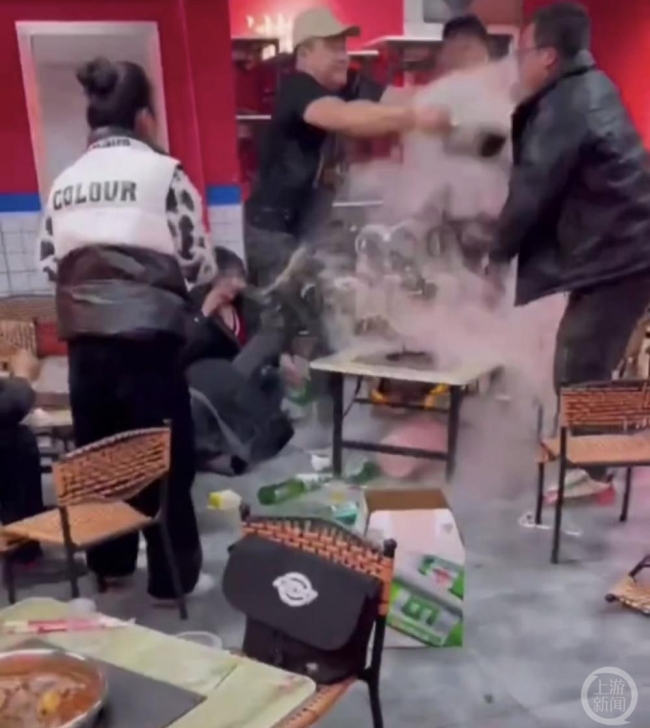 此前拉架男子又捡起酒瓶开始攻击黑衣女子,黑衣女子身旁穿T恤的男子用酒瓶开始攻击“拉架男子”,后穿T恤的男子摔倒,身旁炉子燃起火光,T恤男子又端起火锅热汤泼向拉架男子。